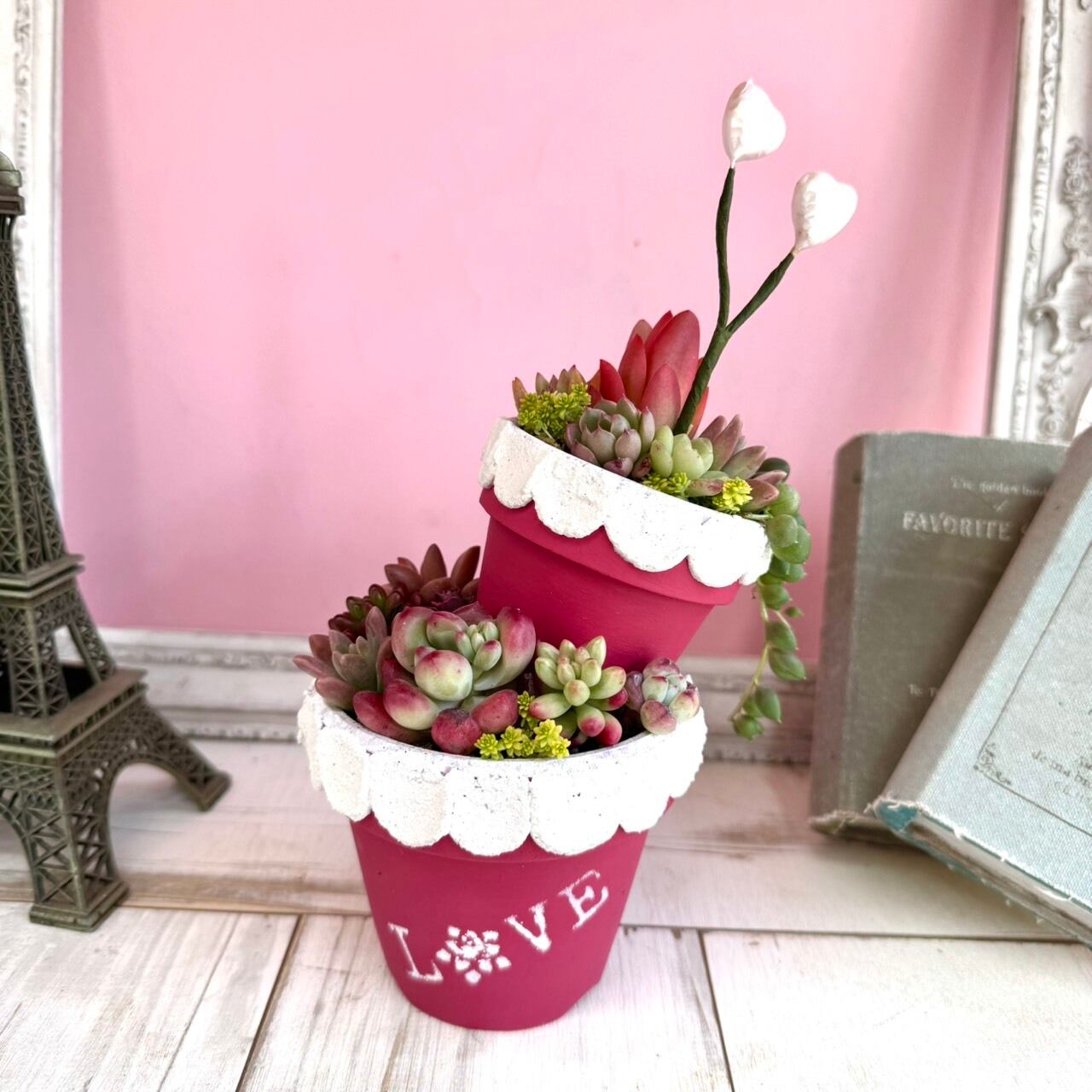 ・鉢:ピンク色 2段のリメイク鉢(3号鉢、2号鉢)